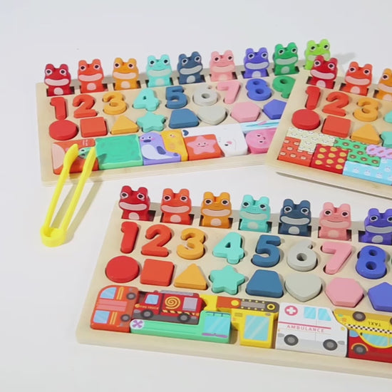 Spark your child’s curiosity and cognitive development with our comprehensive Montessori-style busy board! Designed for children’s early education, this wooden puzzle set offers multiple ways to play, including: